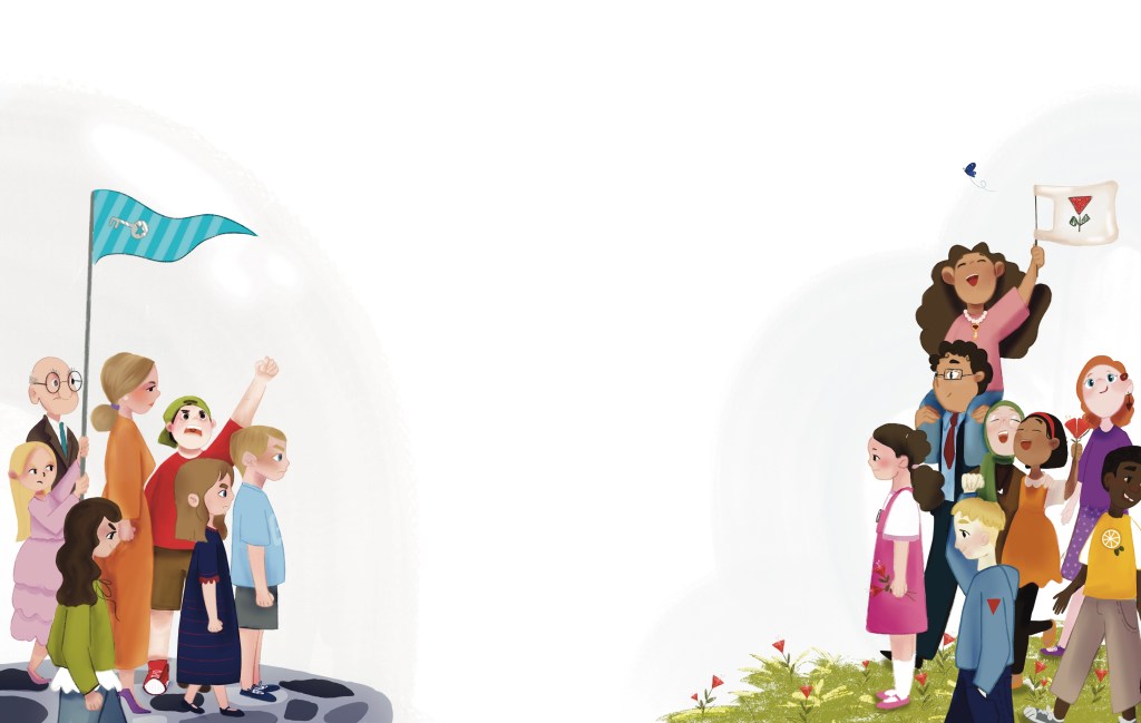 These kids, who had once stood on the other side, began to change. They said, “What’s happening isn’t fair!” They stepped away from their groups and joined the Others. They danced together, played games, and learned about sharing and being fair.