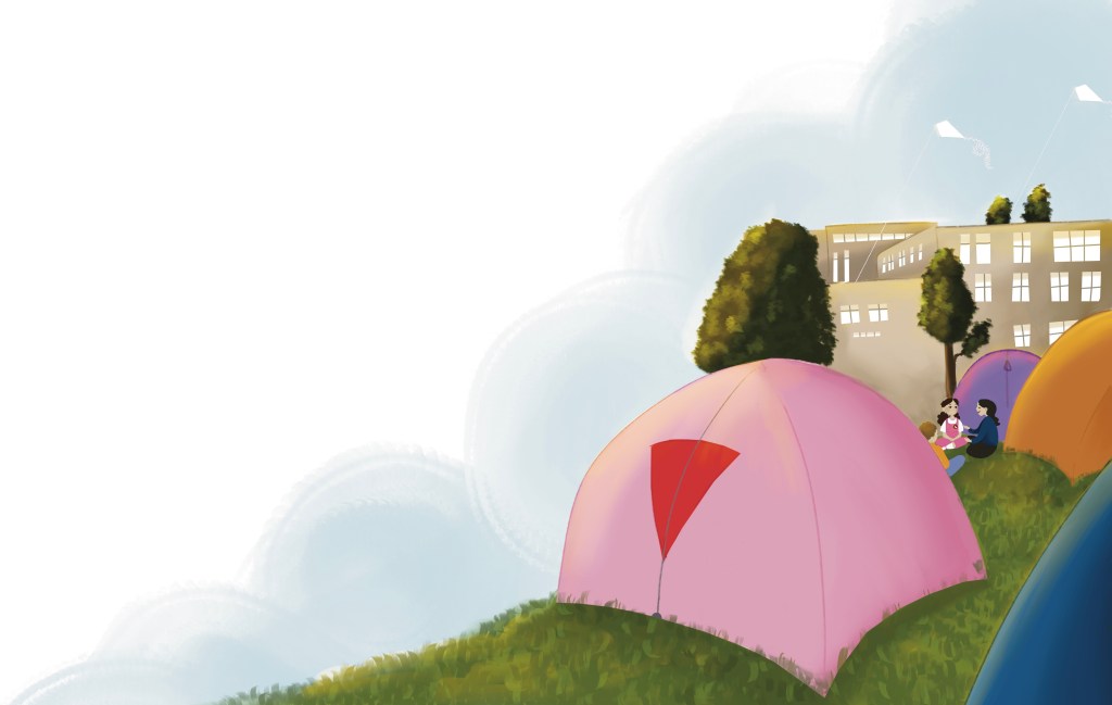 The Others grew closer to the Supporters each day, discovering new ways to fight for their freedom together. After protests, banners, boycotts, and wearing block-patterned shirts, they came up with a bold new idea: They would set up a camp in the schoolyard and go on strike. Instead of going home, they pitched tents and stayed there, night after night. They vowed not to leave until the school principal and teachers stopped siding with the Gilites.